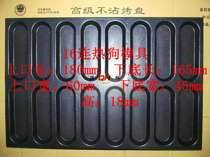 产品3:16连热狗模具上口:18*6cm 下底:16.5*4.5cm 深度:1.8cm